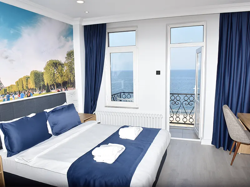Mükemmel bir deniz manzarası eşliğinde unutulmaz bir konaklama deneyimi yaşamak isteyen misafirlerimiz için standart deniz manzaralı odalarımızı öneriyoruz. Odalarımız, panoramik bir deniz manzarasına sahip olup, balkon sunmaktadır, böylece misafirlerimiz denizin keyfini çıkarabilirler. Odalarımızda aynı zamanda geniş bir yatak, televizyon, kasa, mini bar ve kablosuz internet gibi olanaklar bulunmaktadır. Konforunuz için duş, tuvalet ve saç kurutma makinesi gibi temel ihtiyaçları karşılayan özellikler de mevcuttur.